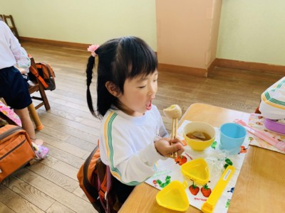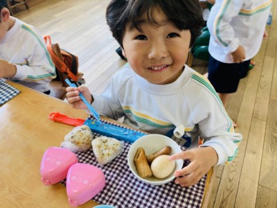 お楽しみのごはんは、前日に畑で収穫した大根とみんなが殻むきをした卵がはいったおでん!