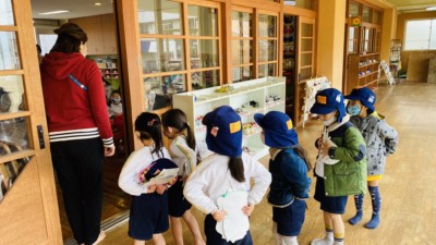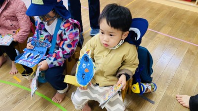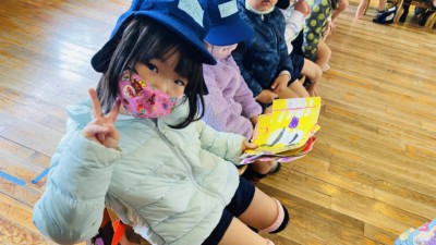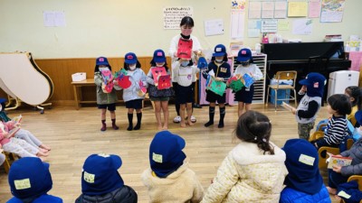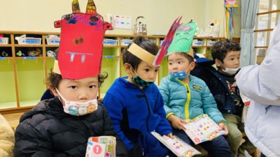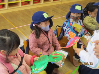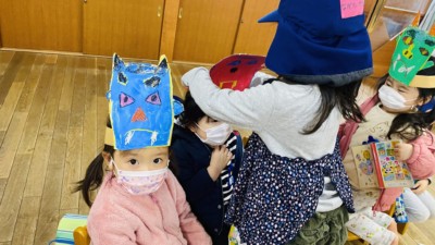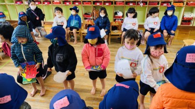 2月2日の節分の日に向けて、年中組のみんなで作った鬼のお面を年少組・どんぐり組さんにプレゼントしました。