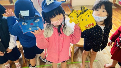 年中さんからもらったお面を被って、鬼に負けずにがんばってね!