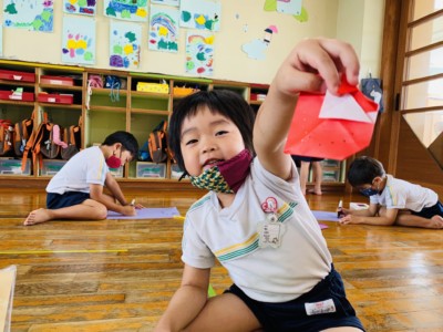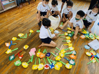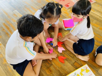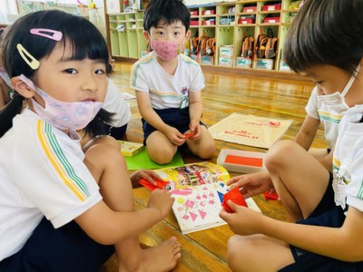 折り紙の本をみながら折り方を調べたり、班ごとに工夫をして作りました。
