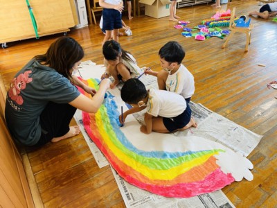 誕生児さんの冠は、4,5,6月にちなんだ絵を子どもたちで出し合い、自分で絵を描いて色を塗り、冠に貼って飾り付けをしていきます。